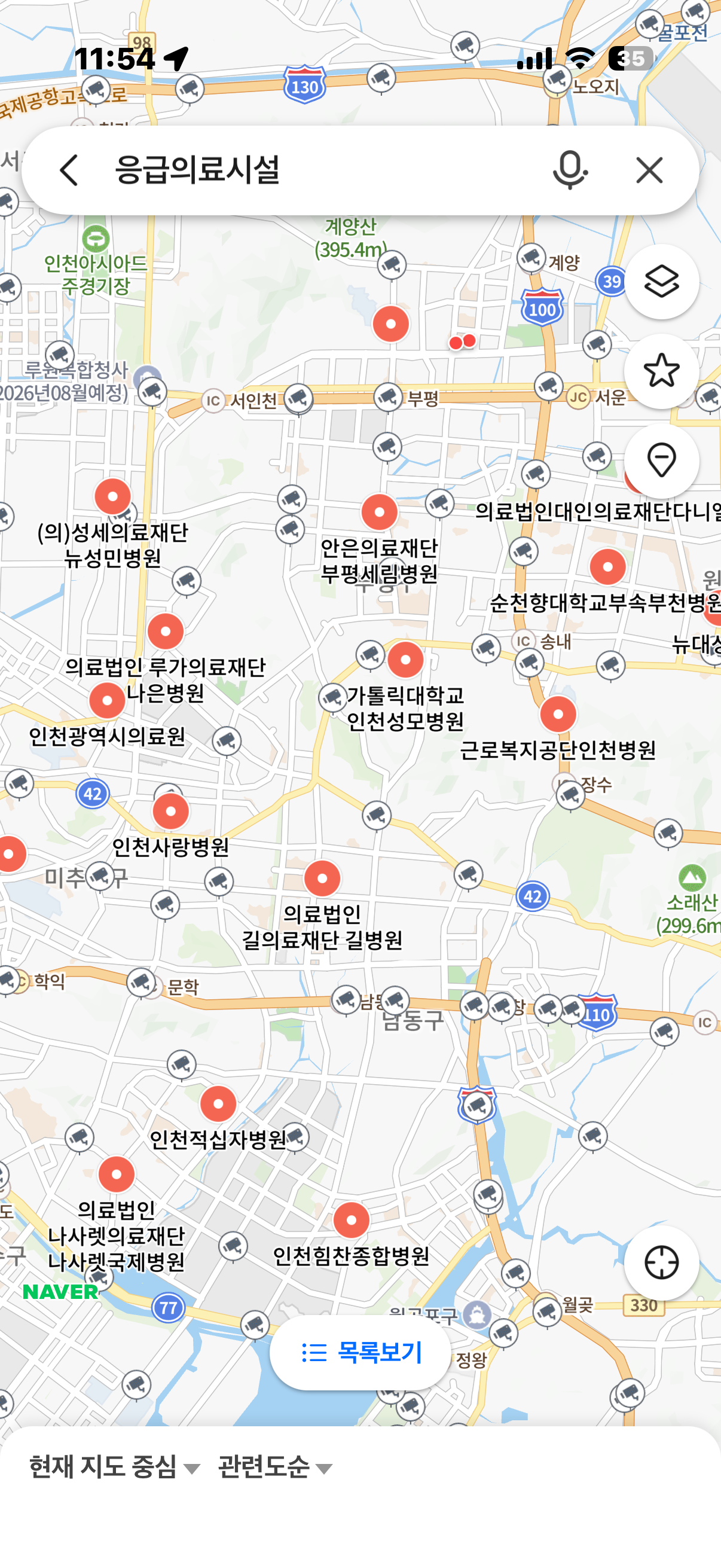 지도에서 검색이 가능한 응급진료시설을 확인할 수 있다.