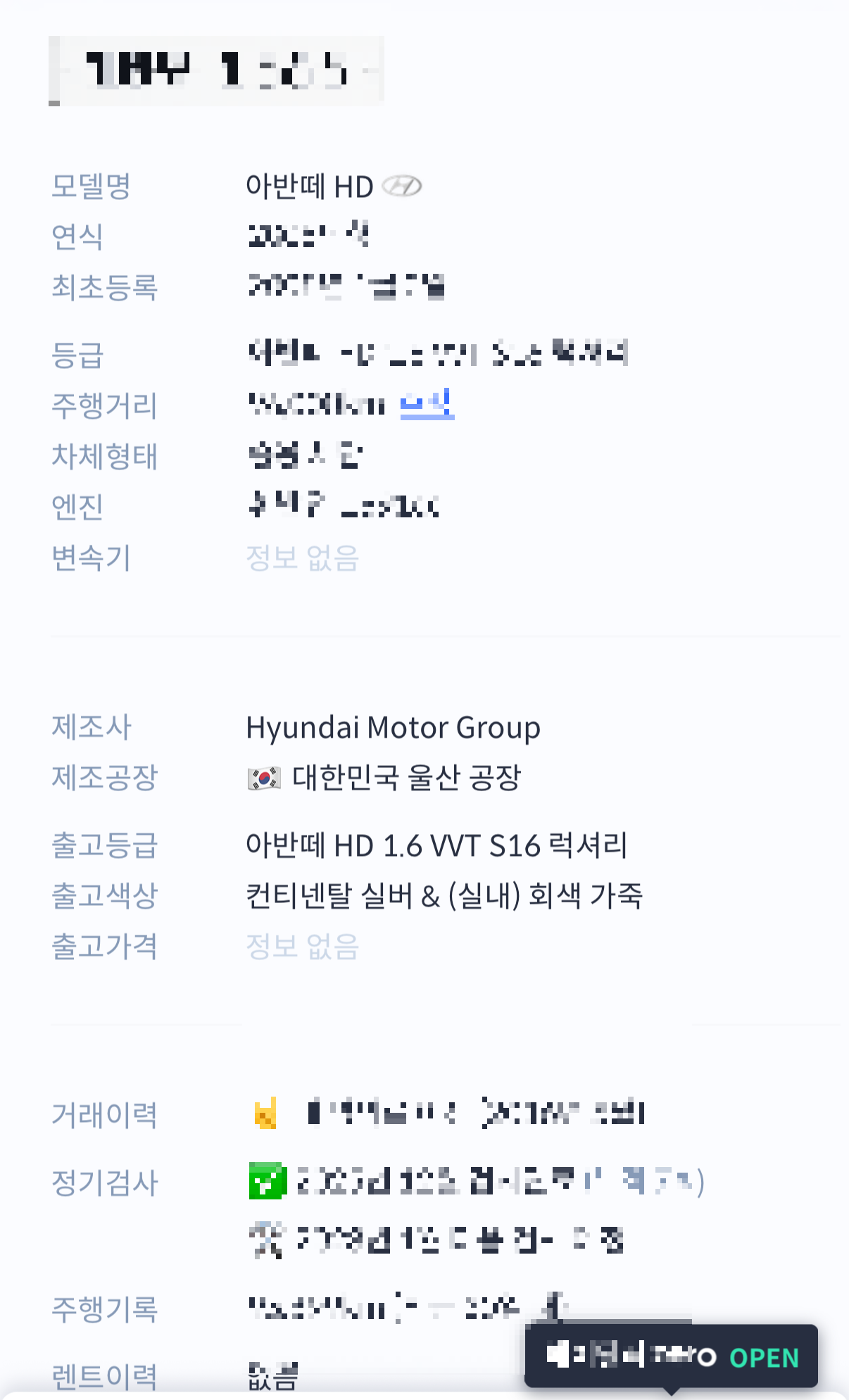 기본적인 차량 제원 외에도 제조공장, 정기검사 유무(예정일), 거래이력, 누적주행기록, 보험이력 등 도 상세히 확인 할 수 있다.